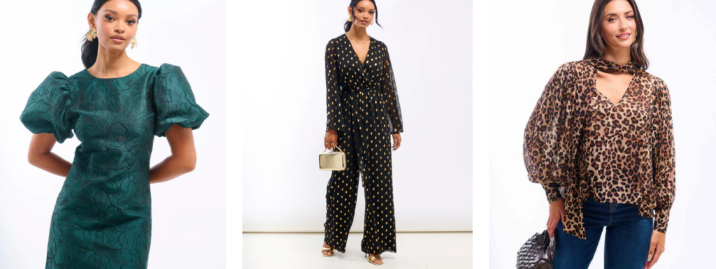 - Dresses: From midi dresses to maxi dresses, party dresses to casual styles — including pieces with puff sleeves, foil or chiffon fabric, and bold animal prints.