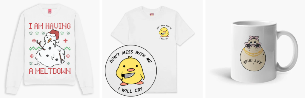 Browsing the Sassy Spud site is like entering a playground of personality. You’ll find a diverse collection of unisex clothing — from T‑shirts and sweatshirts to hoodies, joggers, and accessories. Their designs range from witty and irreverent, to silly or comforting, and always with a touch of sass.