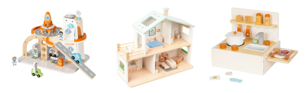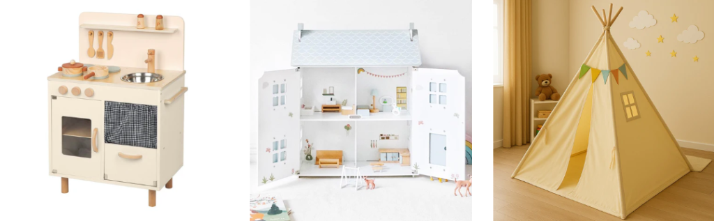 - Role-play and pretend-play sets — play kitchens, dollhouses, market-stall sets, and other items that stimulate imaginative and social play.