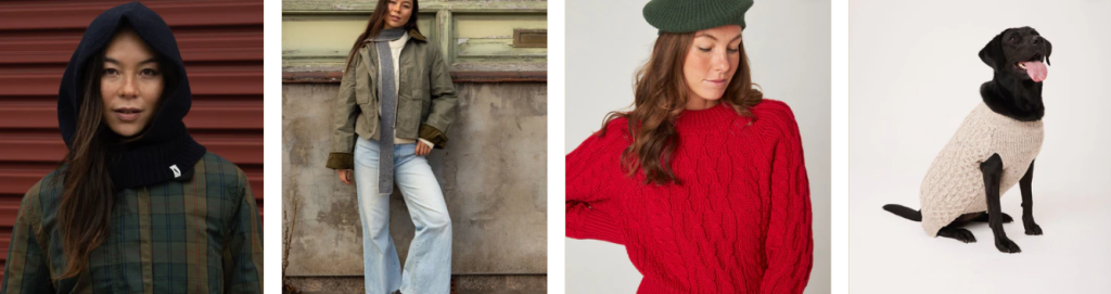 - Knitwear — classic jumpers and cardigans such as their signature cable‑knit jumper and Aran styles, waffle‑crew knits, chunky fisherman‑style roll‑necks, and soft Merino or British‑wool cardigans.